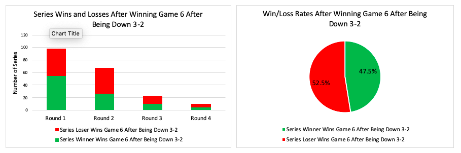 Game 6 has just two possible outcomes; either the team up 3-2 wins the series, or the team down 3-2 wins to tie the series and force a game 7. Because the former results in an automatic series win, this analysis will only look at the success rate of teams who win game 6 after being down 3-2. In other words, this scenario answers the question of whether winning game 6 to force a game 7 is more advantageous than being up 3-2 and failing to close out the series in game 6. While the common sense hypothesis may be that teams who win game 6 carry the momentum into game 7, the stats don’t support this, as 47.5% of teams who win game 6 to force game 7 win that game 7.