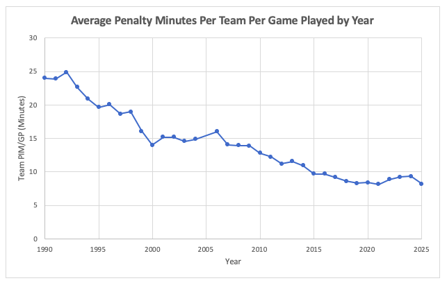 So in what way has the game changed over the past 10 seasons that would be reflected in the goaltending and scoring stats? One key difference between hockey today and hockey 10-20+ years ago is the skill level. This is not to say the old NHL wasn’t also skilled, but with a shift away from the physical part of the game, in part due to stricter rules after the end of the dead puck era, the development of young players today has a much larger emphasis on the skill aspect of the game. Unfortunately, this is difficult to visibly show due to the hits statistic being recorded using an unreliable method, however, the sheer decrease in penalty minutes each year inadvertently showcases a decrease in fighting majors and general penalties that would be caused by physicality, such as boarding or charging penalties.