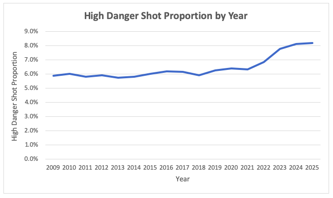 While the development of younger players is shifting to a more skill focused style of play, current players are also shifting as analytics have evolved. Players are now more aware of optimal shot selection, weaknesses of opposing goaltenders, etc. One example of this is the increase in the proportion of shots taken that are high danger versus low danger or medium danger. These statistics are based on the advanced statistics website MoneyPuck.com, where they define a low danger shot as a shot with a less than 8% expected goal value, a medium danger shot as a shot with an expected goal value between 8% and 20%, and a high danger shot as a shot with an expected goal value above 20%.