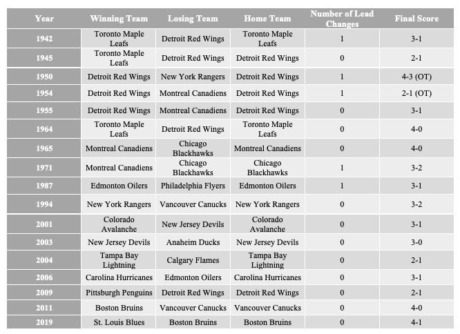 Of the 17 game seven Stanley Cup winners, 12 of them scored the first goal. However, scoring first has been an even stronger factor in recent years, as the last eight Stanley Cup Final game sevens saw the team scoring first winning the Stanley Cup. In fact, in all eight of these games, the team that scored first also scored the next goal to go up 2-0, with the losing team never tying the game. As a result, the last lead change in a SCF game seven was in 1987, when the Flyers scored first followed by three Oilers goals. Why is it so rare to see a lead change, and why do teams that go up 1-0 often score the next goal? The most probable reason is the team that scores first instills panic into the opponent knowing what is on the line, causing them to make riskier plays that can then turn into mistakes that the leading team can further capitalize on.