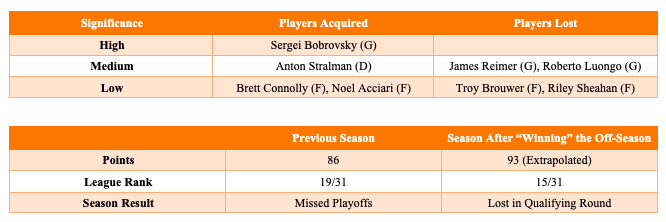 For the third time since 2009, the Florida Panthers had won an off-season. The previous two occurrences led to short-term improvements, whereas their third off-season win would carry an important piece to their eventual Stanley Cup win in 2024. Sergei Bobrovsky was one of the best goaltenders in the league in 2019, and was a fantastic piece for their future compared to previous goaltender James Reimer, as well as Roberto Luongo who retired during the 2019 off-season. Although the Panthers didn’t see much change the following season, as their standings rank only increased slightly, and they still had one of the worst goals against in the league, the Panthers would become one of the best teams in the league during the 2021 season. Ironically, Sergei Bobrovsky was not necessarily a huge part of their success, and many questioned if his large contract was worth it until he proved his value in both 2023 and 2024 playoff runs.