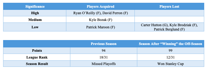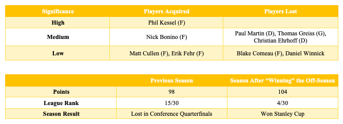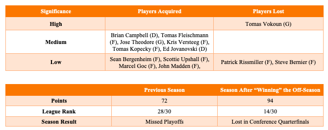 Teams that won the off-season saw point improvements in 10 out of 15 following regular seasons. Additionally, six out of 13 teams (not including recent teams such as the Senators and Red Wings) saw consistent post-season appearances, or even Stanley Cup wins in the long-term. Only four of these 13 teams saw little to no success in the long-term after having a winning off-season.