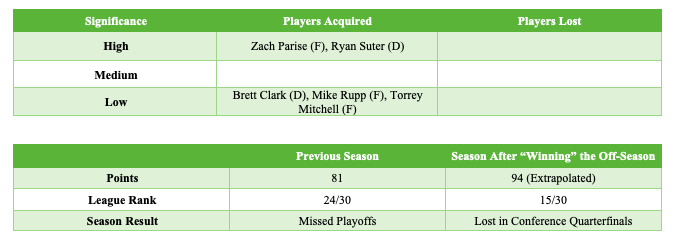 In the 2012 off-season, the Minnesota Wild lost zero players of any significance, while gaining two players that would become cornerstone pieces of the team for years to come, Zach Parise and Ryan Suter. After missing the playoffs for four straight seasons, the Wild returned to the playoffs in 2013, and would continue to make the playoffs every year until 2018-2019.
