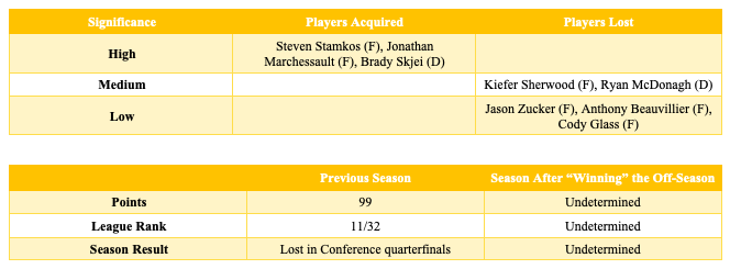 The 2021 off-season winner is up for debate, as some had actually argued that the 2021 off-season was not a success for the Hurricanes. However, despite the loss of Dougie Hamilton, the acquisition of Frederik Andersen as well as other depth pieces made the Hurricanes improve on paper in the short-term. Of all teams examined in this article, the 2021-2022 Hurricanes saw the most consistent results from one season to the next. The Hurricanes changed by only one point, saw the same overall standings rank, and had the same result in the playoffs. The Hurricanes would continue to be one of the best teams in the league for every season up to the current day, however, they have not managed to get past eight wins in one playoff run.