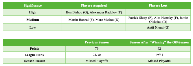 By the 2017 off-season, the most noticeable struggle of the Dallas Stars had been goaltending, as even when they placed second in the league during the 2015-2016 season, they had placed 19th in goals against. The Stars addressed this by acquiring one of the best goaltenders in the league, Ben Bishop. Additionally, they were able to land top line winger Alexander Radulov, as well as more solid pieces to improve their roster. Although the Stars would miss the playoffs the following season, they still saw a noticeable improvement in points, and would return to the playoffs in 2018-2019. Thanks to other roster changes and coaching changes, the Stars suddenly became one of the stingiest defensive teams in the league. They would even make it to the Stanley Cup Finals in 2020, although Ben Bishop was not a key piece of the team at that point due to injury.