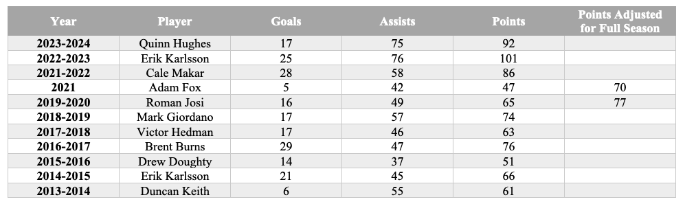 Comparing points to other important defensive stats leaders from 2013-2014 to 2023-2024, excluding shortened seasons due to Covid-19. Mark Giordano won the Norris Trophy in 2018-2019 while also leading the league in plus/minus.