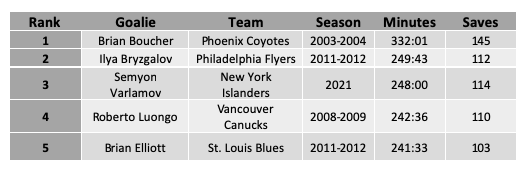 In the 2003-2004 season, Brian Boucher of the Phoenix Coyotes had a stretch of 332:01 without allowing a goal. That is five whole games and then some without allowing a single goal. While there have been a small handful of goalies since then to reach the 230-250 minute mark without allowing a goal, resulting in anywhere from two to four shutouts in a row, reaching the five consecutive shutout mark, and eclipsing 330 minutes without allowing a goal, seems extremely unlikely to happen again. Part of why this likely won't happen again is due to scoring being higher than it was back in the 03-04 season when Boucher achieved this feat, while the other is simply due to the fact that it is such a difficult milestone to achieve.