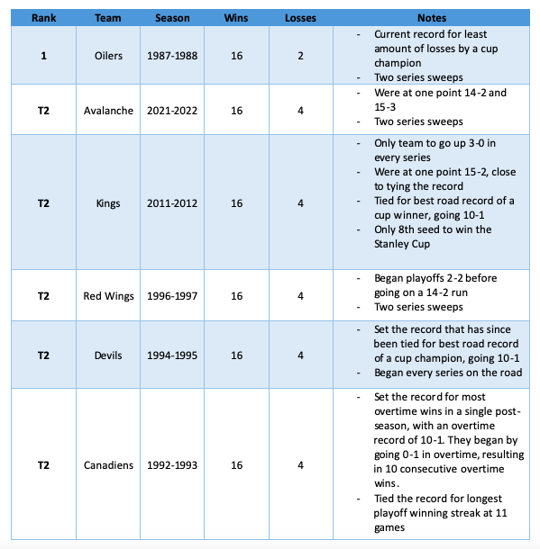 Ranking of Stanley Cup Champions with the fewest losses